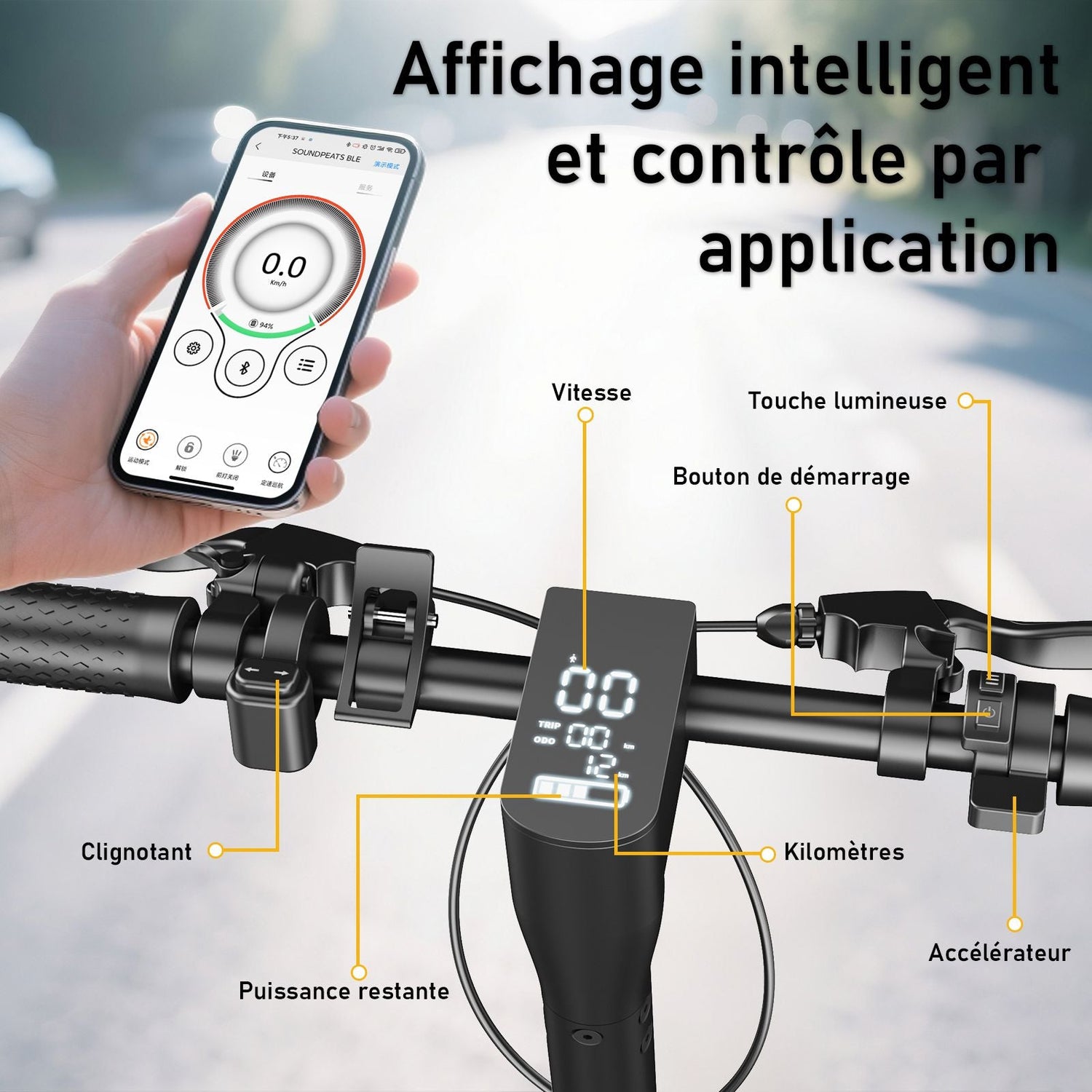 TODIMART X1 features a clear, easy-to-read LCD dashboard that displays your real-time speed, gear mode, trip distance, and remaining battery power at a glance. Pair it with your smartphone via Bluetooth to unlock advanced controls like custom speed limits, cruise mode, and ride analytics — putting total command of your scooter right in your pocket.