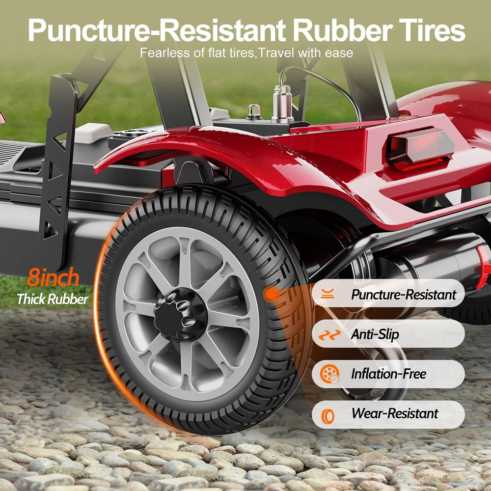 Safe and worry-free driving: The YL-211A four-wheel drive vehicle is equipped with 8-inch high-density airless tires, which say goodbye to the problems of punctures and air leaks caused by traditional pneumatic tires. It can adapt to a variety of complex road surfaces, is wear-resistant and shock-resistant, making driving safer and more worry-free. The tires are made of high-quality elastic materials with excellent shock absorption, allowing for a smooth ride even on bumpy roads. The anti-theft front lock design further ensures vehicle safety, effectively preventing theft.
